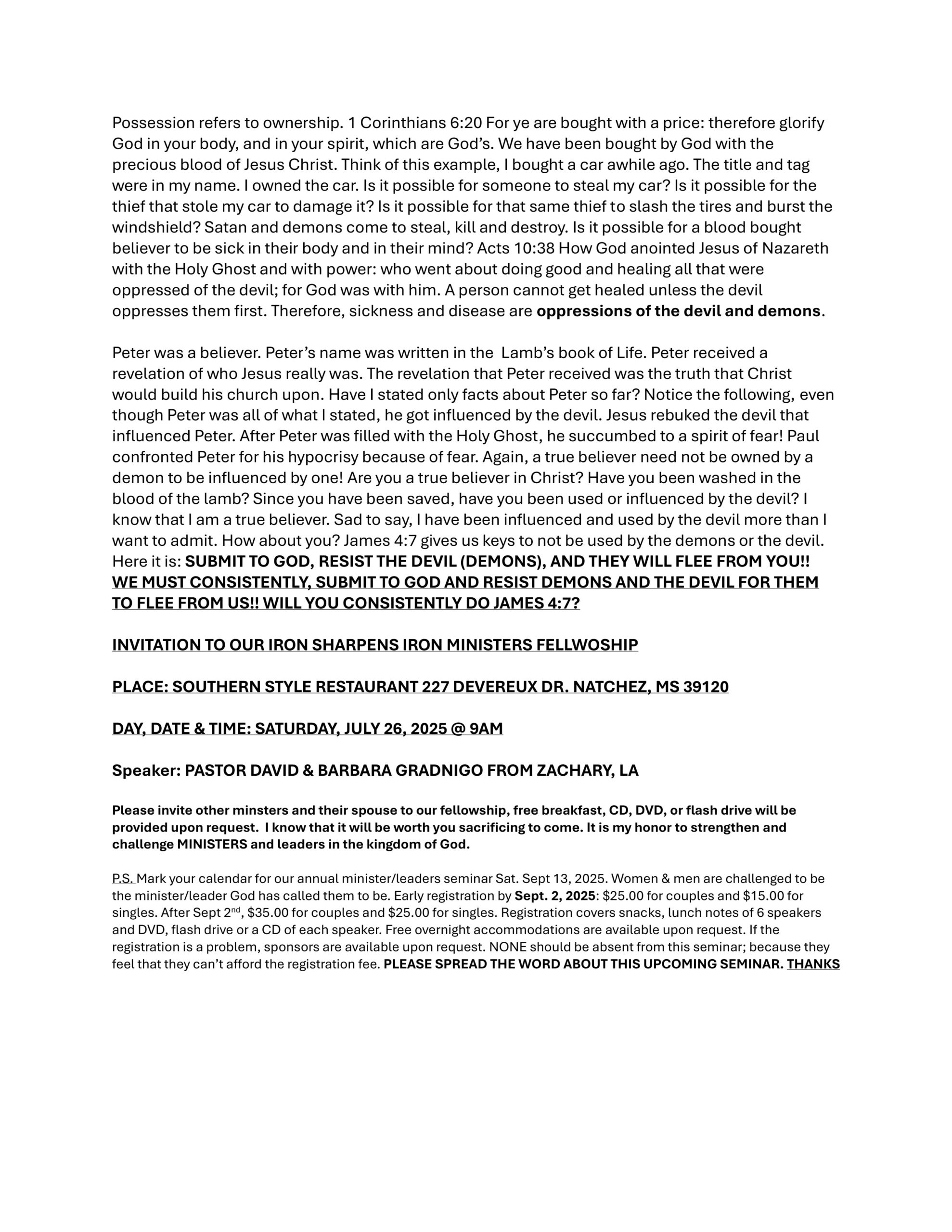 Here are the details to our next IRON SHARPENS IRON minister’s fellowship: FREE Lunch 0 1:45pm Place: Bethel Church 204 Airport Rd Vidalia, LA 71373 Date and Time: July 14th @3:OOpm
